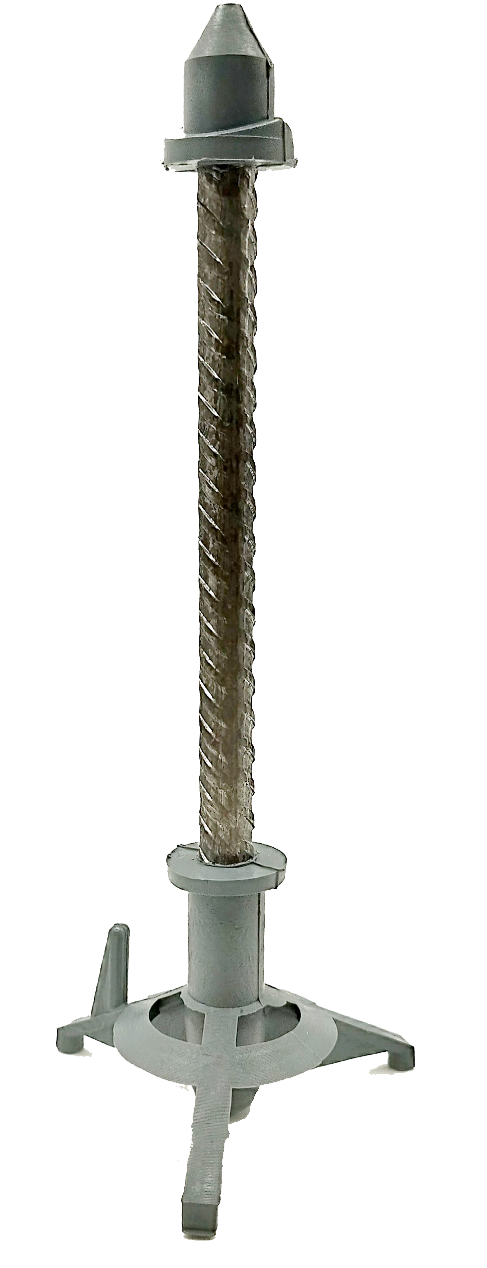 Spacer made of a 10 mm thick reinforcing steel, which is overmolded with plastic (polyethylene) at both ends. With its three feet, this spacer stands stable and upright.